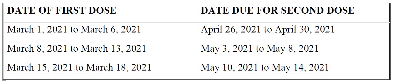 Based on guidance from the World Health Organization on the protocol for administering the AstraZeneca Vaccine, Saint Lucia has revised the interval for the second dose, increasing it from 6 weeks to 8 weeks. This has been done given the increased effectiveness which results from a wider period of time for receiving the second dose. As such, people who received their vaccine at the beginning of the campaign shall receive the second dose as follows: