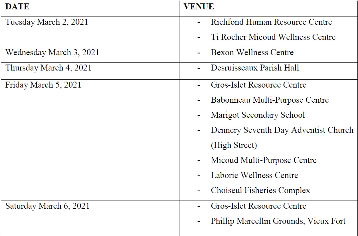 In Phase 1B, people who are 65 years and older; residents of elderly homes and people living with chronic health conditions will be vaccinated. People are encouraged to pre-register ahead of time via the online platform https://hmi.govt.lc/ or at the Community Wellness Centre nearest to you. The Ministry of Health will be implementing Phases 1A and 1B at the same time.